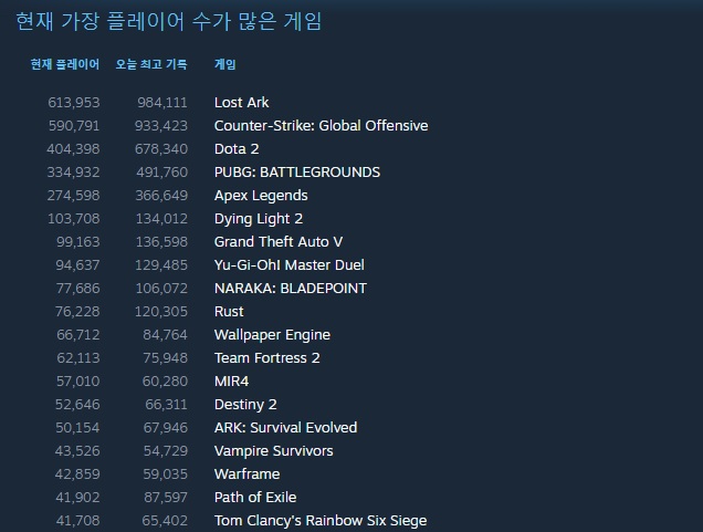 한편, 로스트아크의 이번 기록은 스팀 역대 동시접속자 TOP 5에 기록됐다. 그동안 5위였던 아마존의 MMORPG 뉴월드를 넘어섰으며, 4위였던 사이버펑크 2077(105만)과는 격차가 그리 크지 않은 편이다. 특히, 스팀에 서비스하는 로스트아크는 국내 서버와 마찬가지로 부분유료화 방식으로 서비스되는 만큼 향후 더 많은 동시접속자 수를 기대할 수 있을 것으로 보인다.