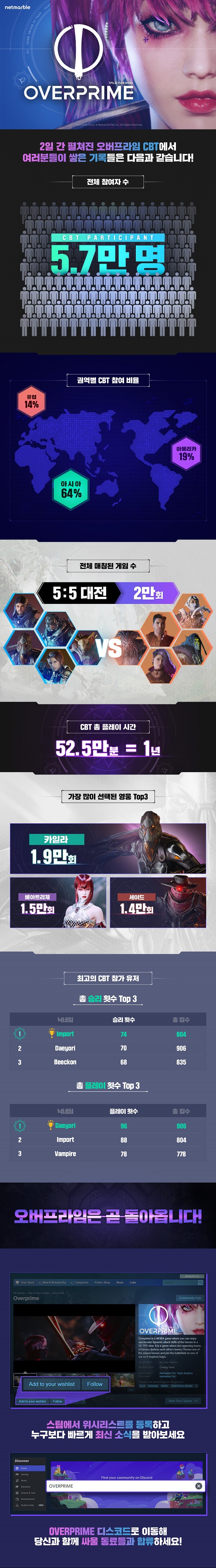 [자료제공 = 넷마블] 넷마블(대표 권영식, 도기욱)은 3D TPS 진지점령(MOBA) PC게임 '오버프라임'(개발사 넷마블에프앤씨) 비공개 시범 테스트(Closed Beta Test, 이하 CBT) 결과를 담은 인포그래픽을 공개했다고 21일 밝혔다.