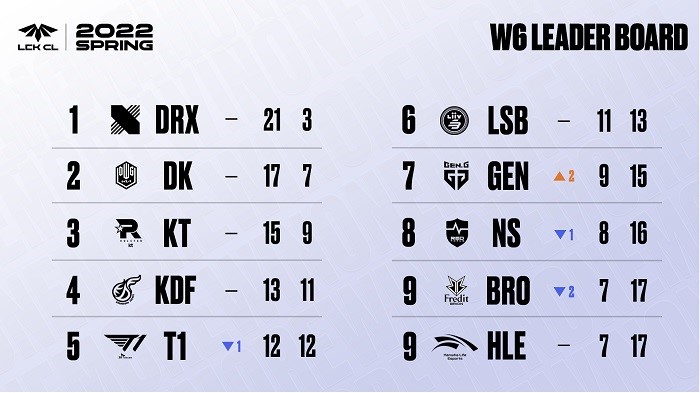 지난 6주차에서는 DRX가 유일하게 4승을 기록해 현재 21승 3패로 단독 1위를 지켰다. 담원 기아와 kt 롤스터는 3승을 추가해 2위(17승 7패)와 3위(15승 9패)에 안착했으며, 광동 프릭스는 2승을 추가해 4위(13승 11패)로 그 뒤를 따랐다.