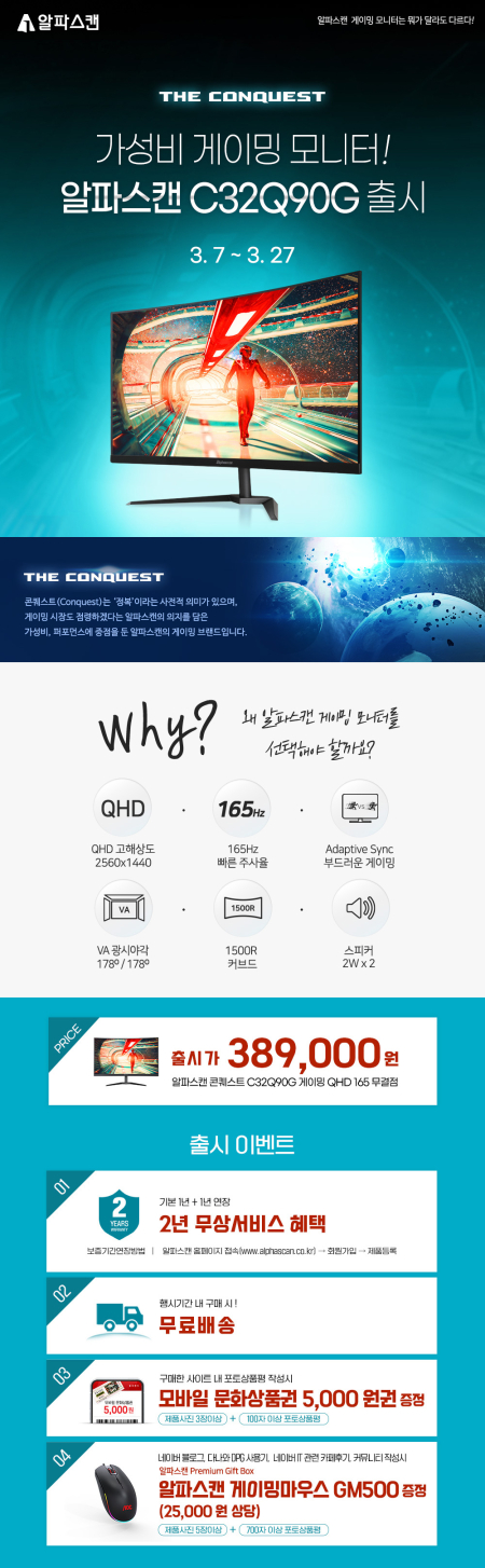 알파스캔 측은 “신제품은 몰입감 높은 32인치 커브드 화면, QHD 해상도, 165Hz 고주사율, 어댑티브싱크를 기본으로 조준선, 게임모드 등 게임에 특화된 기능을 제공하여 FPS 게임 유저들에게 높은 승률을 선사할 것”이라며 “많은 고객들이 알파스캔 콘퀘스트 신제품으로 최고의 게이밍 경험을 즐기기를 기대한다”고 밝혔다.
