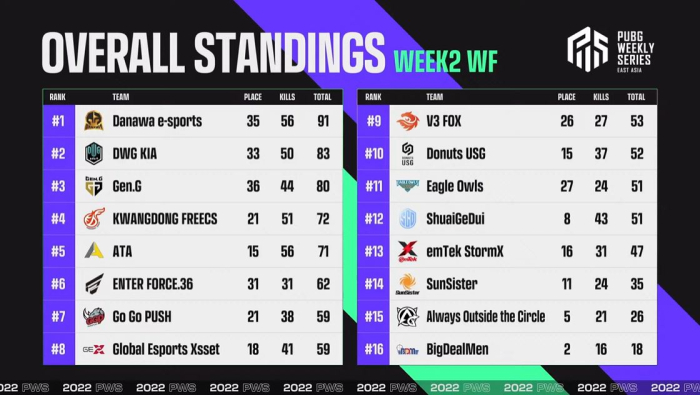 그 결과, 2주 차 위클리 파이널에서는 한국의 Danawa e-sports가 킬 포인트 공동 1위(56 포인트), 순위 포인트 2위(35 포인트)를 기록하며 합산 91 포인트로 2주 차 승리팀에 등극했다. Danawa e-sports의 Seoul 선수가 총 22킬로 2주 차 위클리 파이널 킬 리더를 차지하는 등 착실하게 킬 포인트를 적립했다. Danawa e-sports는 마지막 매치인 매치10 초반에 일본의 Donuts USG와의 교전으로 위기가 있었으나 Salute선수의 슈퍼플레이로 1위 자리를 유지할 수 있었다.