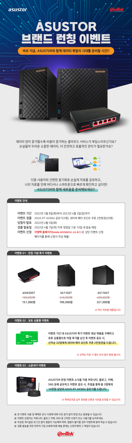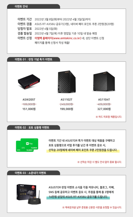 ASUSTOR 브랜드 런칭 기념 특가 이벤트는 다양한 온라인 쇼핑몰을 통해 진행된다. 3월 8일(화)부터 4월 3일(일)까지 한정 수량 구매 가능하며, 최저가 대비 최대 20% 할인된 가격으로 만나 볼 수 있다. 구매 고객 대상으로 이엠텍 홈페이지를 통해 포토 상품평 이벤트를 진행하여 선착순 20명에게 네이버 페이 포인트 쿠폰 2만원권을 증정한다. 또한, 누구나 참여 가능한 소문내기 이벤트를 진행하여 3명에게 추첨을 통해 ASUS RT-AX56U 공유기를 증정한다. 한정 기간 동안 다양한 이벤트로 ASUSTOR 제품을 만날 볼 수 있어 고객님들의 많은 참여가 예상된다.