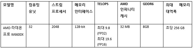 어워드 수상작인 AMD RDNA™ 2 아키텍처를 기반으로 설계된 라데온 프로 W6600X 그래픽 카드는 AMD 인피니티 캐시™(AMD Infinity Cache™) 등 AMD의 첨단 그래픽 기술을 통해 여러가지 전문가용 애플리케이션과 워크로드에서 탁월한 비주얼과 성능을 선사할 계획이다.