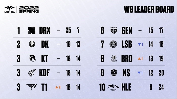 8주차에서 담원 기아가 2위(19승 13패)를 유지하는 동시에 플레이오프 진출을 확정했다. kt 롤스터, 광동 프릭스, T1은 2승을 추가해 공동 3위(18승 14패)를 기록했다. 공동 3위의 3개 팀들은 마지막 주차에서 승수를 쌓는다면 담원 기아를 제치고 플레이오프 2라운드에 직행할 가능성이 열려있어 순위가 변동될 수 있다.