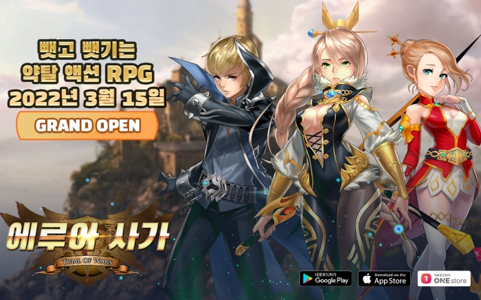 에루아사가는 구글스토어, 앱스토어, 원스토어에서 다운로드 후 플레이 할 수 있다.