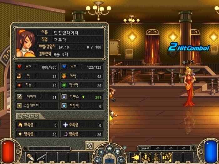 게임을 시작하면 주점 맵에서 몇 가지 스킬을 배운 캐릭터로 준비 시간도 없이 고블린과 전투에 돌입한다. 그때 당시 던파 인터페이스를 그대로 구현했으며 원작과 동일하게 방향키와 기본 공격, 스킬 키를 조합해 커맨드로 캐릭터별 스킬을 사용해가며 적을 상대할 수 있다.