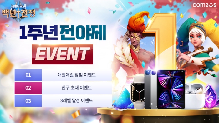 ‘백년전쟁’은 글로벌 히트작 ‘서머너즈 워’ IP를 기반으로 한 실시간 전략 대전 게임으로, 몬스터 육성 전략과 카운터 시스템 등으로 예측불허의 짜릿한 전투 재미를 선사한다. 컴투스는 이번 전야제 이벤트를 통해 오는 ‘백년전쟁’ 1주년 업데이트에 대한 기대감을 높이고, 도입 예정인 신규 재화를 비롯한 다양한 혜택을 제공하는 기회도 마련했다.