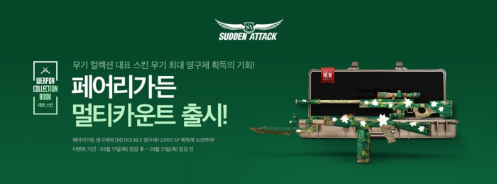 넥슨은 따뜻한 봄을 알리는 ‘페어리가든’ 무기 멀티카운트를 4월 21일까지 출시한다. ‘페어리가든’ 스킨 무기를 3종 활성화하면 경험치 및 포인트를 20% 추가 제공하는 등 각종 세트 효과가 발동한다. 3월 31일까지 ‘페어리가든’ 멀티카운트를 통해 무기 획득 기간 총 300일과 600일 수집 시 각각 ‘페어리가든’ 무기 영구제 선택권과 더블 모드 변신 기능이 적용된 신규 마이건2를 획득할 수 있는 ‘Double 마이건2’ 무기 영구제 선택권을 선물한다.