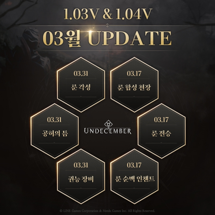 ‘언디셈버’는 이번 업데이트 외에도 오는 3월31일 ‘룬 각성’ 추가 및 ‘권능 장비’ 추가 등의 콘텐츠 업데이트를 예고하고 있다. 게임에 대한 정보 및 업데이트, 이벤트 안내는 라인게임즈 플로어(FLOOR)를 비롯해 페이스북, 디스코드 등 SNS 채널과, 공식 유튜브 채널을 통해 확인할 수 있다.