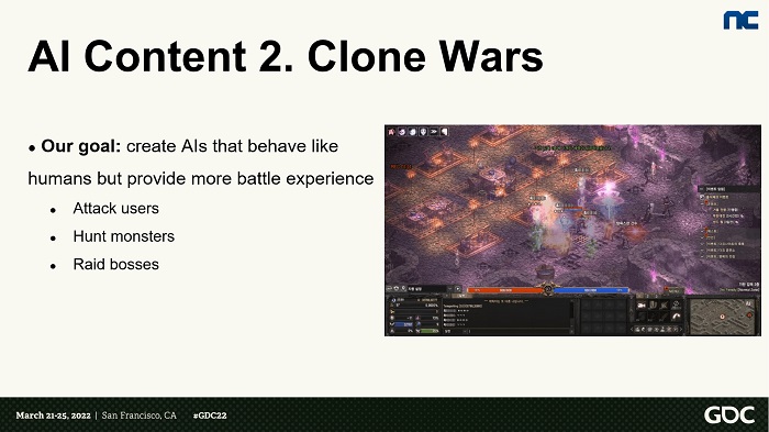 엔씨(NC) 안진형 AI 엔지니어는 “MMORPG의 특성상 반복되는 패턴의 사냥으로 플레이어가 피로감을 느끼기 쉬운데, AI 강화학습 기술로 이 점을 보완했다”며 “이번에 연구한 콘텐츠는 게임에 색다른 긴장감을 부여하는 수단으로 AI를 활용할 가능성을 확인했다는 것에 큰 의미가 있다”고 설명했다.