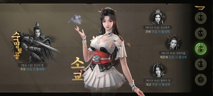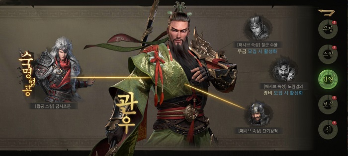 무성 관우와 마초 간의 숙명 시스템을 활성화한 뒤 두 무장을 함께 전장에 내보내면 협공 스킬 금시초문으로 적군에게 큰 피해를 줄 수 있으며, 안량과의 숙명 시스템을 활성화하면 패시브 속성 단기참적이 발동되어 보병의 공격력이 상승한다.
