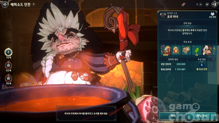 1주 차 일반 난이도는 총 3가지 단계로 구성됐다. 1단계는 권장 전투력 20만, 2단계는 권장 전투력 75만, 3단계는 권장 전투력 135만이다. 보스 '엄격한 스승 요리 마녀'는 불속성 몬스터로 물속성 무기를 추천하며, 신규 4성 희귀 물속성 공격형 이마젠 '푸푸'나 4성 불속성 방어형 이마젠 '꿀꾸리'를 사용하면 피해량을 높일 수 있다.
