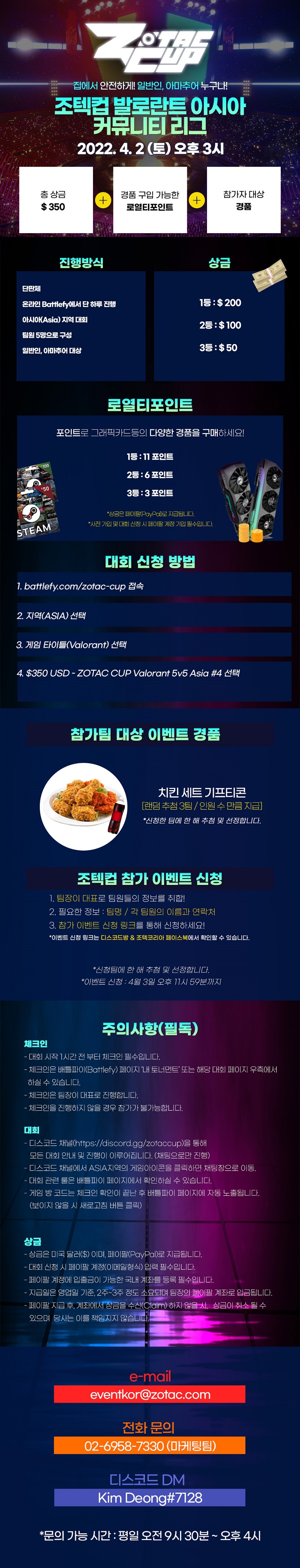 4월 2일 토요일 오후 3시부터는 ‘조텍컵 발로란트 아시아 커뮤니티 리그’가 진행된다. 총 상금은 350달러 규모이며, 팀전 싱글 일리미네이션 방식으로 하루 동안 진행된다.