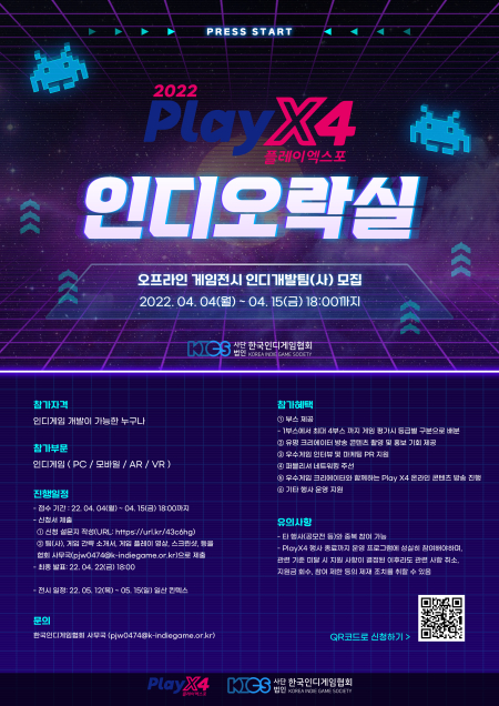 ‘인디오락실’ 참가 신청 접수는 4월 4일부터 15일 18:00시까지이며, 신청 설문지 작성또는 포스터 하단의 QR코드를 통해 접수가 가능하다. ‘인디오락실’ 참가는 플레이 가능한 버전의 빌드만 있다면 PC, 모바일, VR, AR 등 개발 플랫폼 제한 없이 인디게임 개발자(사) 누구나 가능하다.