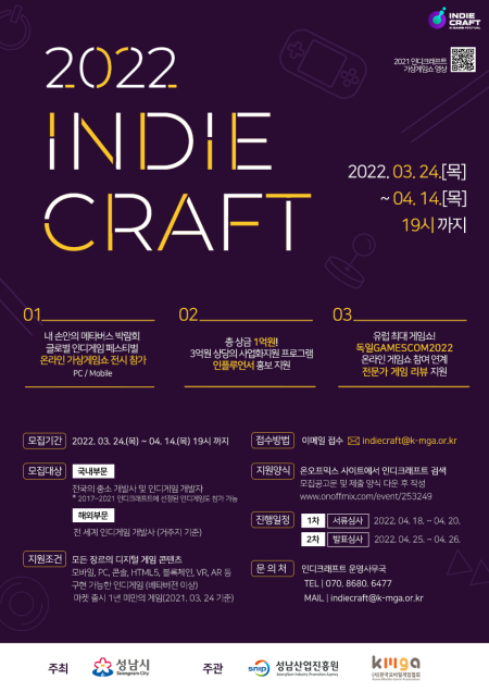 글로벌 인디게임의 축제가 될 이번 ‘2022 인디크래프트’는 4월 14일까지 출품작 모집을 진행하고 있다. 모집 관련 공고문 및 제출서류 양식은 모임전문사이트 온오프믹스에서 다운로드 받을 수 있으며, 검색창에 ‘인디크래프트’를 검색해도 확인할 수 있다.