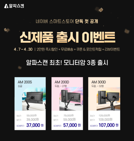 [자료제공 = 알파스캔] 알파스캔이 모니터 암 3종을 출시하고 출시 기념 행사를 진행한다고 밝혔다. 알파스캔 최초로 출시한 모니터암 신제품은 싱글 암 1개와 듀얼 암 2개 모델이며, 작업 공간을 보다 넓고 효율적으로 활용하면서 바른 자세로 작업할 수 있도록 도와준다.