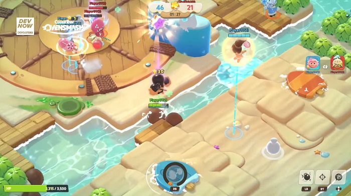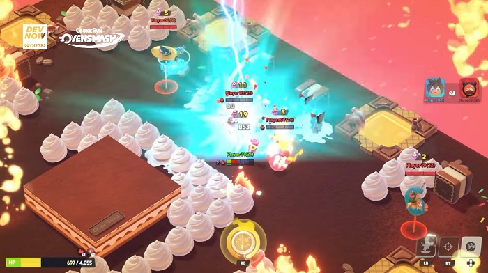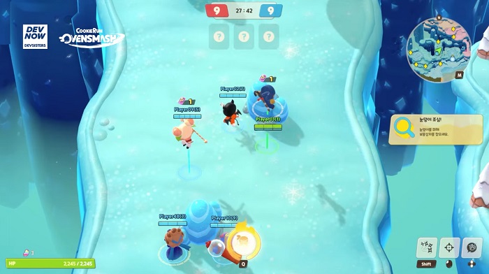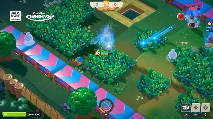 다음으로 준비된 코너는 무차별 대난투 게임 '쿠키런: 오븐스매시'다. 원티드 스타와 배틀로얄 모드, 보물찾기 모드 등의 콘텐츠를 영상으로 공개했는데, 원티드 스타는 팀전을 펼치는 콘텐츠로서 맵의 다양한 장치를 활용해 상대팀을 쓰러뜨리면 된다. 또 배틀로얄 모드는 30명의 플레이어가 맵 내의 파워젤리를 획득하면서 최후의 1인이 되는 것을 목표로 한다.
