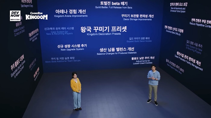 행사에서 가장 먼저 소개된 것은 '쿠키런: 킹덤'의 업데이트 소식이다. 왕국 꾸미기 프리셋, 아레나 경험 개선, 쿠키 팀 저장 슬롯 확장, 신규 성장 시스템 추가, 생산 납품 밸런스 개선, 꾸미기 보관함 편의성 증대, 쿠키 활용도 다양화, 전투 콘텐츠 난이도 다양화 등의 대규모 개선 작업이 이뤄질 것이라고 언급했으며, 새로운 스토리가 추가될 것임을 암시했다.
