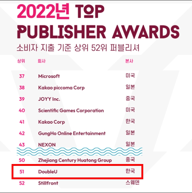 더블유게임즈는 TPA 2022에서 국내 퍼블리셔 4위, 글로벌 퍼블리셔 51위에 등극했다. 지난해 글로벌 퍼블리셔 52위에 이어 2년 연속 선정된 것이다. 이 외에도 넷마블, 엔씨소프트, 카카오 등 국내 주요 게임사들이 선정되며 어깨를 나란히 했다.