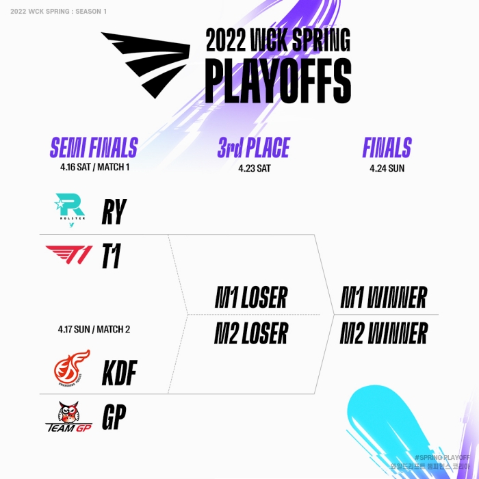 4월 16일과 17일 오후 7시부터 시작하는 2022 WCK 스프링 4강 플레이오프는 트위치, 유튜브, 네이버를 비롯해 LCK 트위치 채널에서도 생중계로 시청할 수 있다.