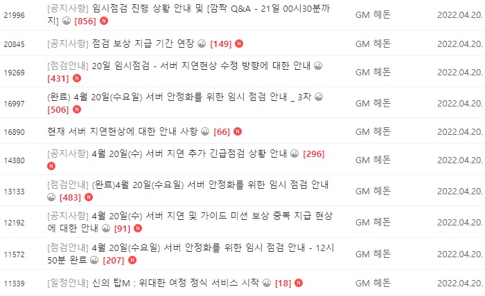 기약 없는 임시점검 시간을 무료하게 보내지 않게 하기 위해 신의 탑M 카페지기 GM 헤돈은 공지사항에 21일 0시 30분까지 댓글 Q&A를 진행한다고 밝혀 유저가 대거 몰리기도 했다. 해당 공지에는 댓글이 800개를 돌파했지만, 아쉽게도 GM 헤돈 혼자서 대응을 하고 있는 만큼 수량에 한계가 있어 오히려 불만을 토로하는 유저도 다수 보였다.