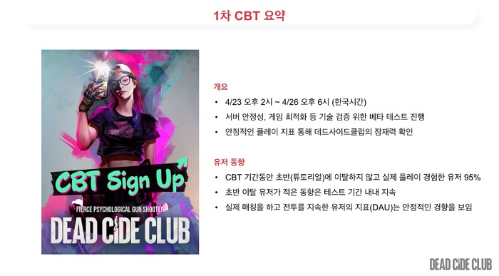 데드사이드클럽에 대한 대략적인 소개 후에는 1차 CBT에 대한 결과를 공유했다. 김성욱 디렉터는 "1차 CBT는 데드사이드클럽을 처음으로 공개하는 자리인 만큼 많은 걱정과 설렘이 교차했던 시간이었다"라고 회상하면서 "서버 안정성과 게임 최적화 등 기술 검증을 주요 목적으로 했다"라고 1차 CBT의 진행 이유를 밝혔다.