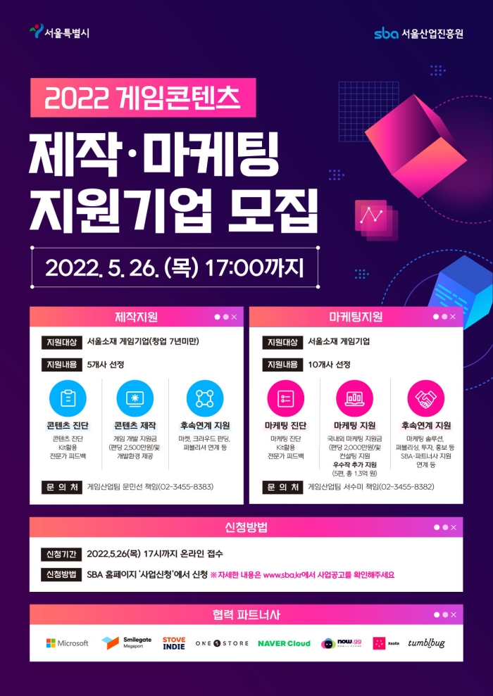‘2022 게임콘텐츠 제작/마케팅지원 사업’에 대한 자세한 내용은 서울산업진흥원 홈페이지 내 기업지원 및 서울사업 메뉴에서 확인하거나, 서울산업진흥원 게임산업팀으로 문의하면 된다.