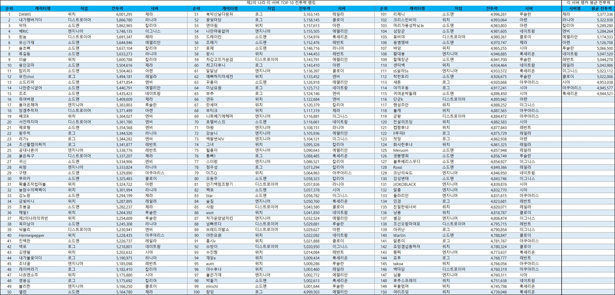- 집계는 18일 9시부터 약 1시간 동안 실시됐으며, 누적 랭킹 메뉴의 캐릭터 전체 랭킹을 기준으로 상위 다섯 명까지 선별했습니다. 집계 시간 동안 랭커들의 활동에 따라 오차가 발생할 수 있습니다.