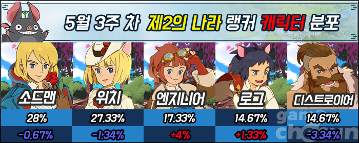 소드맨이 드디어 랭커 직업 점유율에서 28%를 달성하며 1위를 차지했다. 지난 랭킹보다 약간 감소하긴 했지만, 위치 점유율에 비해 근소한 차이로 앞서면서 오랜 2위 생활을 청산하고 1위에 올랐다. 다만, 신규 콘텐츠가 대거 추가된 만큼 당분간 랭킹 변동이 클 것으로 예상되며, 위치의 역전 역시 얼마든지 가능한 상황이다.