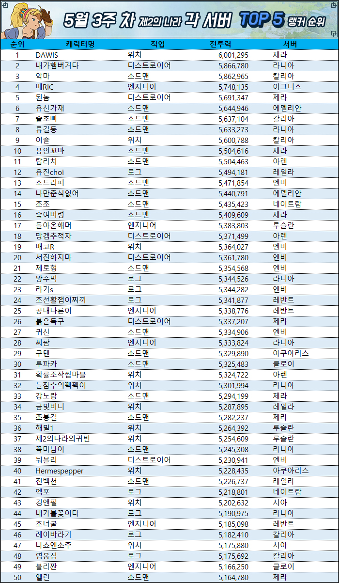 제2의 나라 5월 3주 차 전 서버 전투력 랭킹 1위는 제라 서버 'DAWIS'가 차지했다.