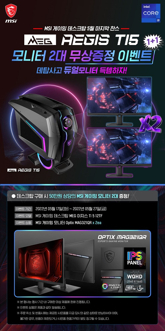 또한, 2022년 5월 16일부터 27일까지 옥션 및 지마켓에서 열리는 ‘빅 스마일 데이’ 기간 동안 ‘MSI MEG 이지스 Ti 5’를 구매하면, 165Hz 주사율과 1ms MPRT 응답속도를 실현한 32형 WQHD(2560*1440) 사양의 모니터, ‘MSI 옵틱스 MAG321QR’ 2대를 선착순으로 증정하는 이벤트를 진행한다고 밝히며, 많은 관심과 참여를 당부했다.