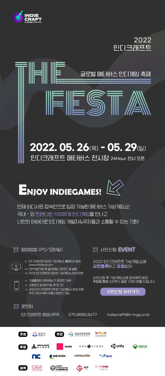 ‘2022 인디크래프트 The FESTA’에 대한 자세한 내용은 인디크래프트 공식홈페이지를 통해서 안내된다. 후원 및 기타 문의사항은 한국모바일게임협회 사무국으로 가능하다.