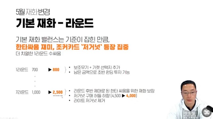 재화 밸런스는 후반부 화력 한타 승부를 살리기 위한 방향으로 조정했다. 1라운드의 재화 지급량을 소폭 늘려 보조무기와 가젯의 선택지가 추가된다. 또 초반 펀딩에 투자할 수 있도록 한다. 7라운드의 재화 지급은 대폭 상승시켰으며 저거넛의 구매 금액을 소폭 조정한다. 이를 통해 저거넛의 활용도를 높이겠다는 계획이다.