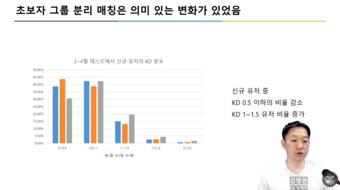 4월 중 진행된 테스트에 대한 리뷰도 진행됐다. 초보자 그룹을 분리하는 매칭과 최대한 비슷한 실력의 유저 간 매칭, 1인/ 2~3인/ 5인을 분리하는 매칭 등 로직에 대한 변경이 적용됐으며, 신규 유저 매칭과 파티 분리 매칭에 대해서는 의미있는 성과가 있었다.