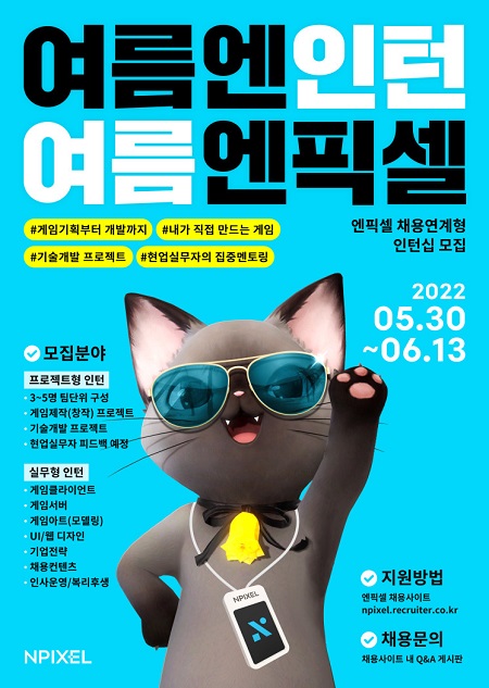 [자료제공 = 엔픽셀] 엔픽셀(공동대표 배봉건, 정현호)이 자사의 채용연계형 인턴십 프로그램 ‘여름엔인턴, 여름엔픽셀’ 지원자를 모집한다고 30일 밝혔다.