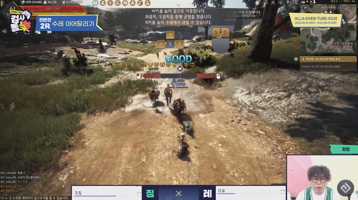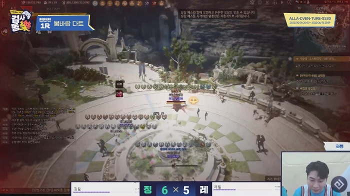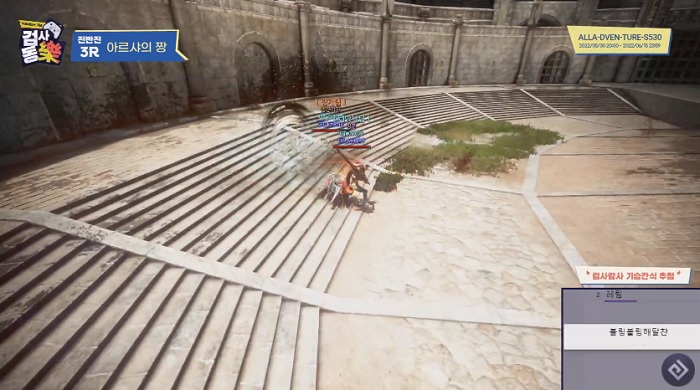 이어서 팀원이 하나가 돼 수레로 이어 달리는 '수레 이어달리기' 대결이 펼쳐졌다. 수레 이어달리기는 칼페온 특별 경기장에서 세 명의 선수가 하나의 수레가 돼 쏟아지는 포탄을 피하면서 먼저 도착하는 팀이 승리하는 룰로 진행됐다. 세번째로 진행된 승부는 '아르샤의 짱'이다. 아르샤의 짱은 검은사막 내 PvP 콘텐츠인 '아르샤의 창'에서 3:3으로 대결을 펼쳤다.