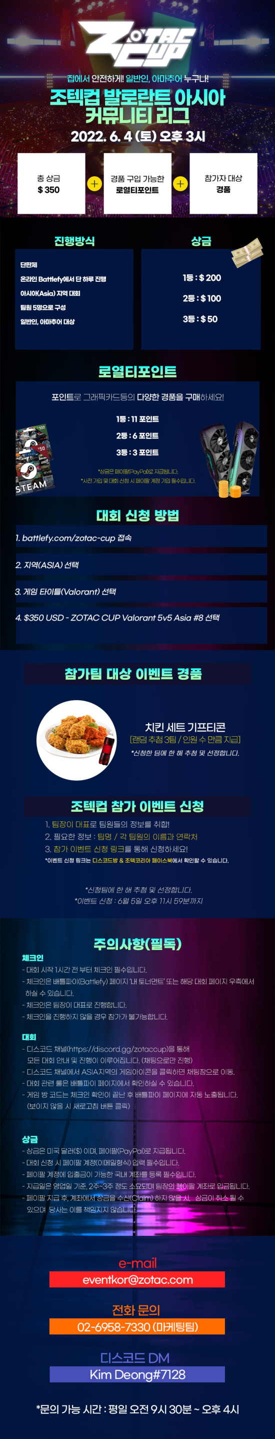 6 월 4일 토요일 오후 3시부터는 ‘조텍컵 발로란트 아시아 커뮤니티 리그’가 진행된다. 총 상금은 350달러 규모이며, 5 v 5 팀전 싱글 일리미네이션 방식으로 하루 동안 진행된다.