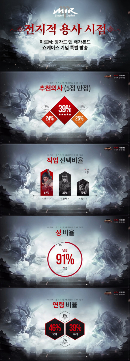 이 밖에도 다양한 기록들이 나왔다. 이용자들이 가장 많이 선택한 직업은 도사(42%)였고, 술사(37%), 전사(22%) 순으로 뒤를 이었다. 테스트 참가자 중 91%가 남성이었고, 3~40대가 85%를 차지했다.
