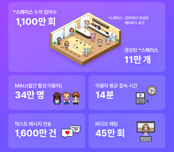 ZEP을 대중에 공개한 후 만 6개월이 지난 지금, ZEP에 접속한 누적 사용자는 100만 명을 넘었고, 스페이스(ZEP 내 메타버스 공간) 참여수는 1,100만 회를 돌파했다.