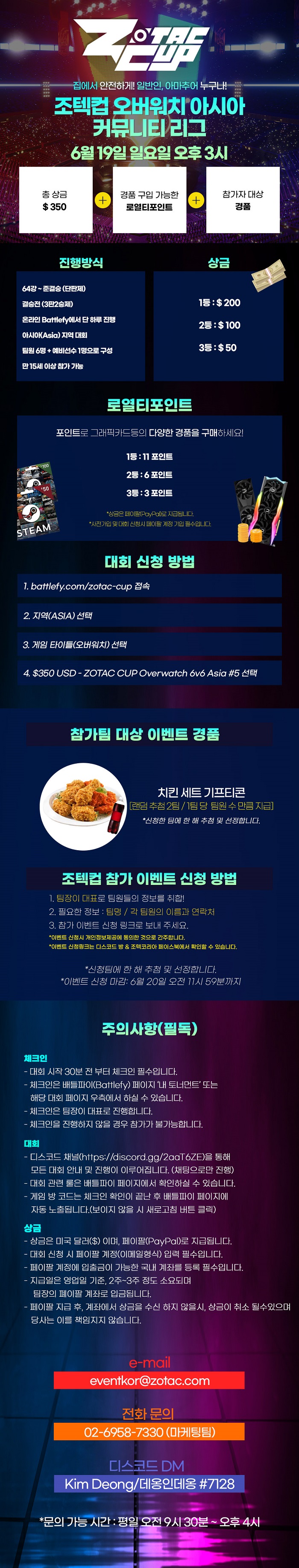 6월 19일 일요일 오후 3시 부터는 ‘조텍컵 오버워치 아시아 커뮤니티 리그’가 진행된다. 총 상금은 350달러 규모이며, 6 v 6 팀전 싱글 일리미네이션 방식으로 하루 동안 진행되며, 결승전과 3,4위 전만 BO3로 진행된다. 1등부터 3등까지 $200, $100, $50을 증정하며, 각각 승리 시에 조텍컵 포인트가 제공된다. 모은 포인트로는 스팀 기프트 카드부터 조텍 그래픽카드까지 다양한 경품과 교환 신청이 가능하다.