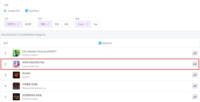 카카오게임즈에 따르면 우마무스메 프리티 더비가 출시된 첫날 각종 모바일 애플리케이션 분석 전문 서비스에서 애플 앱스토어 인기 1위와 매출 2위를 달성한 것으로 집계됐다고 전했다. 출시된 지 반나절도 지나지 않아 모바일 양대 마켓 중 한 곳의 차트를 점령한 것이다.