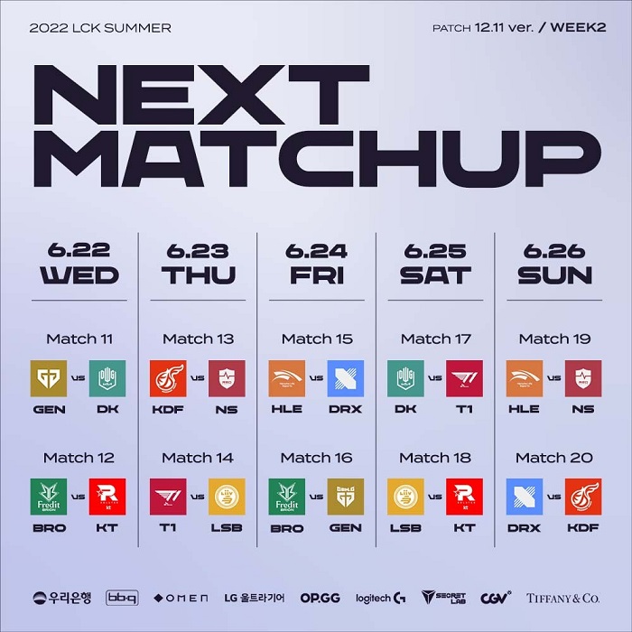 2022 LCK 서머 2주차는 아프리카TV, 네이버 e스포츠&게임, LCK 공식 트위치 채널 등 온라인 플랫폼을 비롯해 아프리카TV 케이블 채널을 통해 생중계된다.