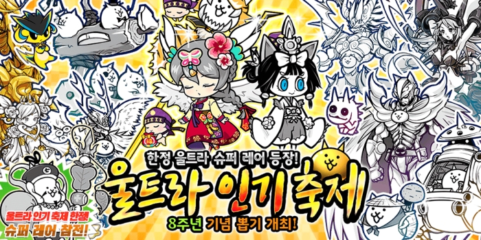 각 뽑기 시리즈의 대표 캐릭터가 참전하는 ‘울트라 인기 축제’에 한국판 한정 캐릭터 ‘꼬마 고양이 발키리’가 참전한다. 개최 기간 중에 레어 뽑기 화면을 탭 하면 ‘울트라 인기 축제’ 레어 뽑기가 가능하다.