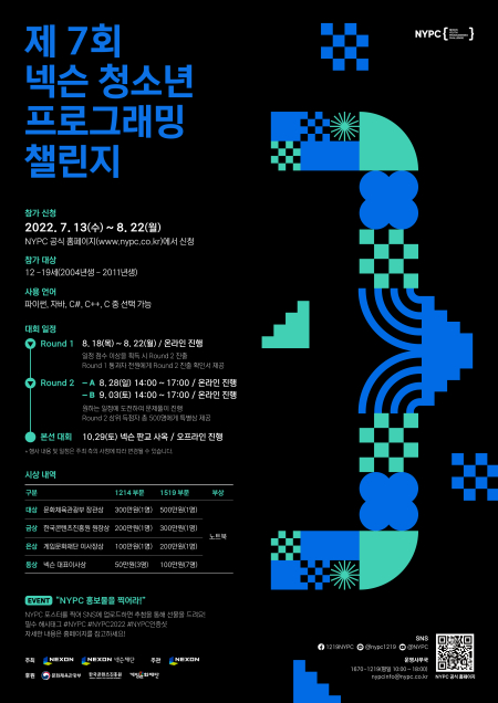 [자료제공 = 넥슨] 넥슨(대표 이정헌)이 오는 10월 29일 ‘제7회 넥슨 청소년 프로그래밍 챌린지 2022(Nexon Youth Programming Challenge, 이하 NYPC)’를 개최한다고 밝히고 새롭게 바뀐 대회 진행방식과 일정을 공개했다.
