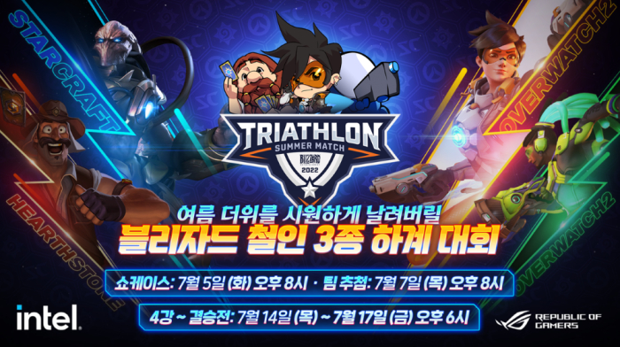 타이틀 스폰서인 인텔 및 ASUS ROG와 함께 하는 ‘블리자드 철인 3종 대회’는 각 게임 종목을 대표하는 20명의 인플루언서가 팀을 이뤄 복합적으로 겨루는 대회이다. 대회 일정은 7월 14일~15일로 예정된 4강을 시작으로 16일 3/4위전, 이어 17일 결승전이 각각 진행되며, 각 경기는 저녁 6시부터 시작된다.