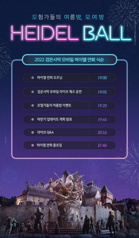 펄어비스는 여름밤의 축제 느낌을 살려 ‘모두 하이델 연회로 모.여.밤!’ 콘셉트로 각종 레크리에이션과 풍성한 보상, 신규 콘텐츠 공개 등 즐길거리와 혜택을 마련했다. 인게임 OST를 재해석한 라이브 재즈 공연도 준비해 축제 분위기를 더할 예정이다.