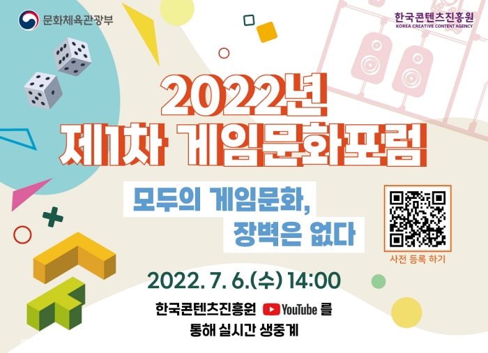 ‘2022년 1차 게임문화포럼’은 누구나 시청할 수 있으며, 콘진원 공식 유튜브 채널을 통해 오는 7월 6일(수) 오후 2시부터 생중계한다. 보다 자세한 내용과 신청방법은 콘진원 누리집에서 확인할 수 있다.