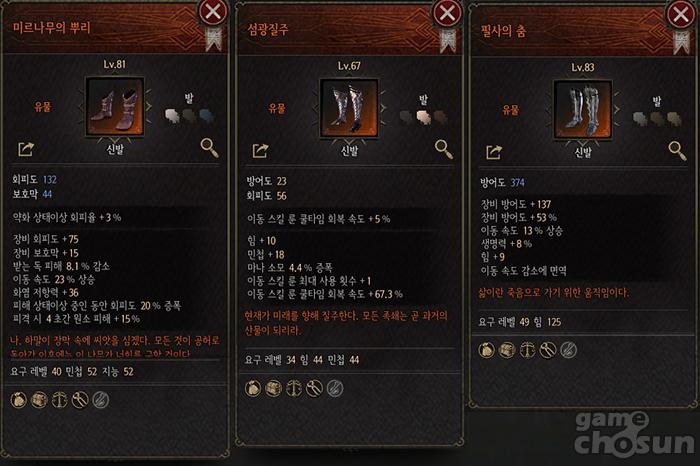 가장 먼저 눈이 가는 것은 신발이다. 신발에는 다양한 옵션들이 붙지만, 액트를 밀거나 파밍하는데 있어 가장 중요한 '이동속도'가 붙는다는 점에서 매력적이다.