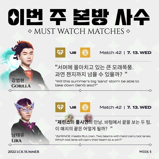 '리그 오브 레전드(LoL)' e스포츠의 한국 프로 리그를 주최하는 리그 오브 레전드 챔피언스 코리아(대표 오상헌, 이하 'LCK')는 오는 13일(수)부터 17일(일)까지 서울 종로구 롤파크에 위치한 LCK 아레나에서 열리는 2022 LCK 서머 5주차에서 1위 젠지와 3위 리브 샌드박스가 대결한다고 밝혔다.