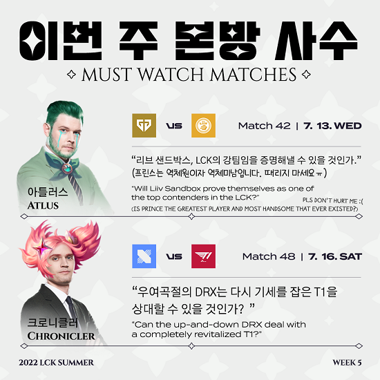LCK를 중계하는 국내외 해설진들도 선두인 젠지와 5연승을 달리고 있는 리브 샌드박스의 매치업을 꼭 봐야 할 경기로 꼽았다.